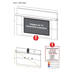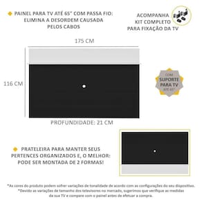 Dimensões do produto montado: Altura: 116cm | Largura: 175cm | Profundidade: 21cm *Devido as variações de tamanho dos televisores no mercado, sugerimos que verifique as medidas da sua TV e compare com o painel antes de efetuar a compra. *Você pode consultar as medidas internas na imagem técnica do produto.