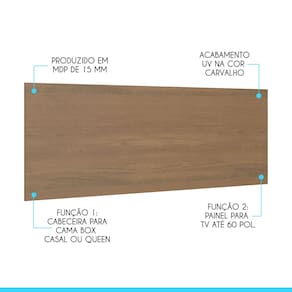 CARACTERÍSTICAS TÉCNICAS: - Produzido em MDP de 15 mm - Acabamento UV na cor Carvalho - Função 1: Cabeceira Cama Box Casal e/ou Queen - Função 2: Painel para TV até 60 Polegadas