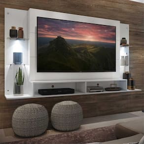 Conteúdo da Embalagem: 1 (um) Painel para TV 1 (um) Kit com 4 Prateleiras de Vidro 1 (um) Kit com 2 Luminárias LED