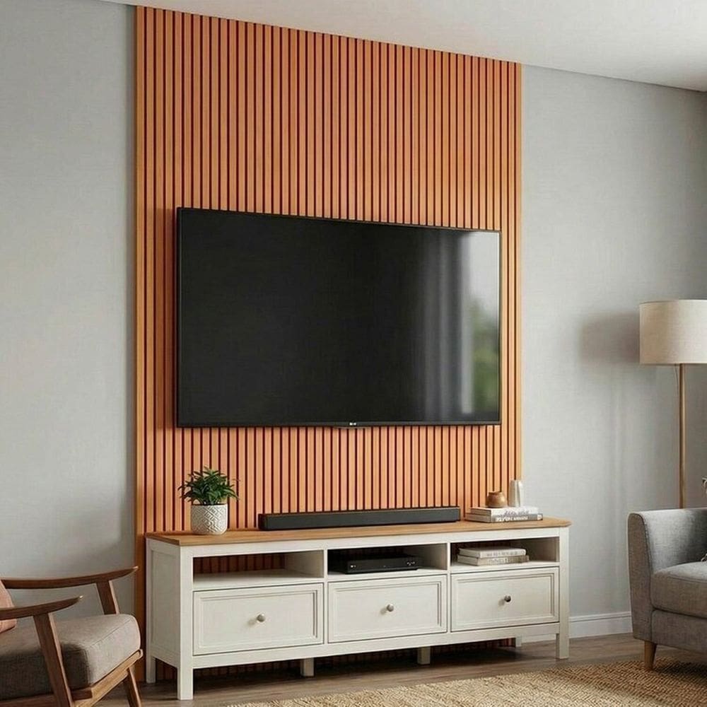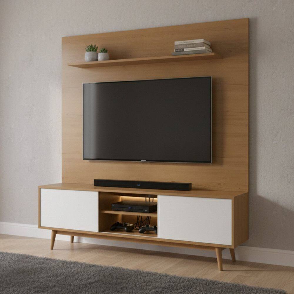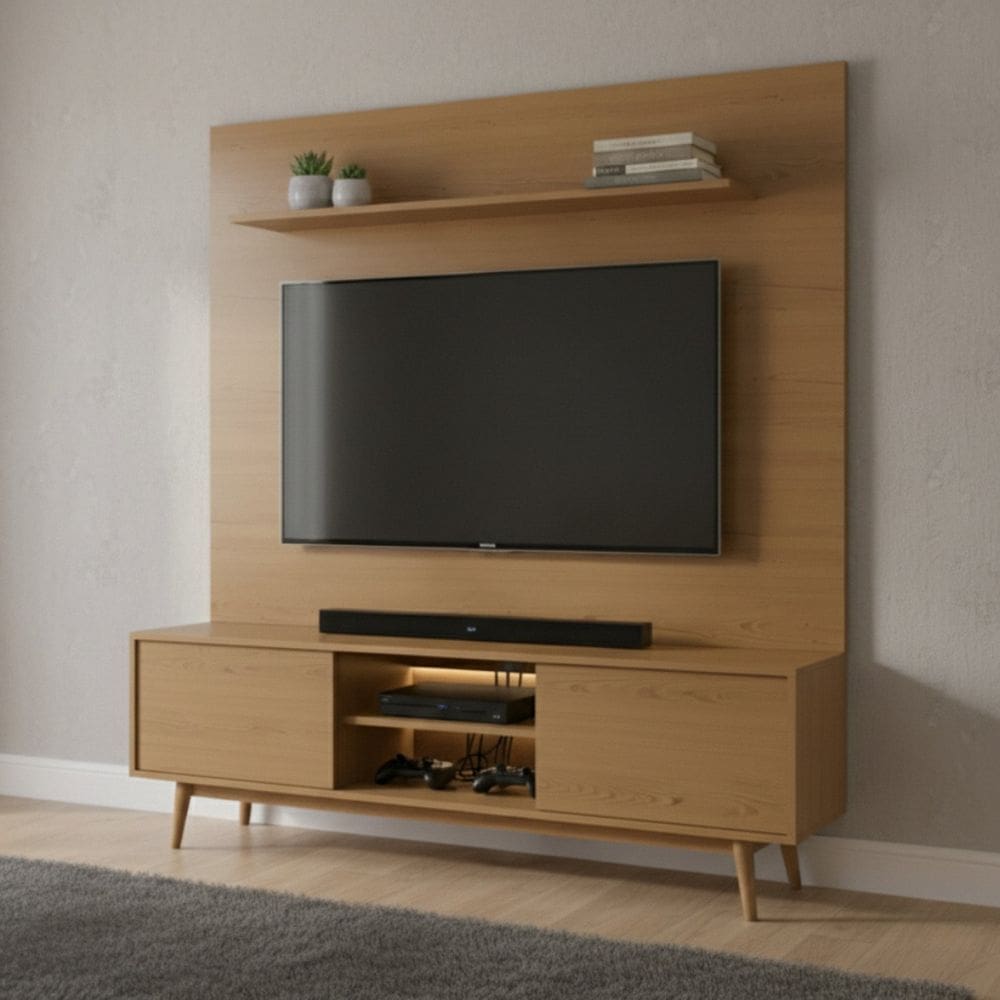 painel com rack com madeira tabica