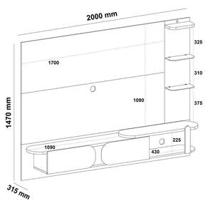 Dimensões do produto montado: Altura: 147cm | Largura: 200cm | Profundidade: 31,5cm *Devido às variações de tamanho dos televisores no mercado, sugerimos que verifique as medidas da sua e compare com as do painel antes de efetuar a compra. *Você pode consultar as medidas detalhadas na imagem técnica do produto.