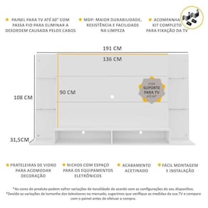 Dimensões do produto montado: Altura: 108 cm | Largura: 191 cm | Profundidade: 31,5 cm Tamanho Painel TV: 136 x 90cm *Devido as variações de tamanho dos televisores no mercado, sugerimos que verifique as medidas da sua TV e compare com o painel antes de efetuar a compra. *Não recomendamos utilizar suporte de TV articulado. *Você pode consultar as medidas internas na imagem técnica do produto.