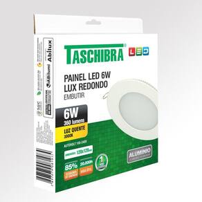Painel de Led Redondo Embutir 6W Bivolt Taschibra 3000K Amarelo Quente - Características Gerais do Produto: Dimensões AxLxP cm : 12 X 12 X 1,5 Nicho do Recorte cm : 11 x 11 Produzido em: Alumínio Voltagem: Autovolt tanto em 110v como em 220v Cor Acabamento: Branco Fosco Potência: 6W Fluxo Luminoso: 360 Lumens Eficiência Luminosa: 60 Lm/W Ângulo de Abertura: 120 Formato: Redondo : 1 ano junto ao fabricante Aplicação: Embutir Vida Útil: 15.000 horas Acompanha Lâmpada: Não necessita, LED já integrado Acompanha o produto: 01 Painel Led Completo 01 Driver Ligação 01 Kit Instalação : 1 ano junto ao fabricante Marca: Não Informado Ean: 7897079081077