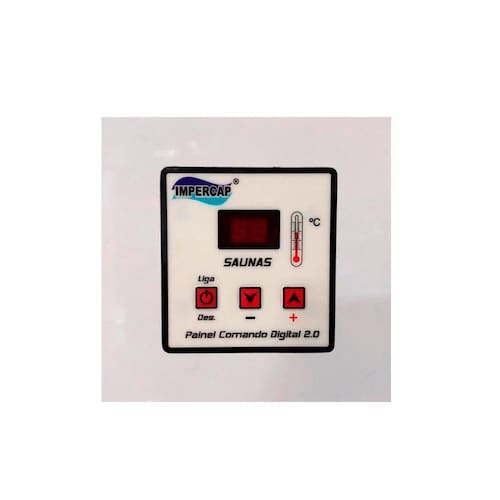Painel 2 Fios vermelho e preto de Comando Digital para Sauna à Vapor Impercap - COMPLETOEspecificações - Quadro de Comando DigitalProfundidade: 3,5 cmLargura: 12,5 cmAltura: 12,5 cmModelo: DigitalBotão: ON/OFFTecla de Temperatura: SimMedidor de Temperatura de Ambiente1m de Bulbo CapilarVisor Indicador de Temperatura: SimFios: 2 Fios vermelho e preto 1. Tecla Liga/Des.: Liga ou Desliga o equipamento.2. Tecla: diminui a temperatura.3. Tecla: aumenta a temperatura.4. Display: indicador de temperatura.5. Fiação 0,45mm: 2 Fios nas cores: vermelho e preto saindo do painel para ser ligados nos fios do equipamento.6. 1 metro de Bulbo capilar sensor do painel : Medidor de temperatura do ambiente, deixa-lo suspenso dentro do ambiente, calafetar o furo para que não entre vapor dentro do painel de comando.Painel de Comando DigitalControla a temperatura do ambiente da sauna, possui um TIMER de 5h caso o usuário esqueça de desligar a sauna, o equipamento irá desligar dentro de 5h.