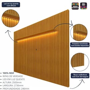 O Conjunto Painel Nobre Ripado + Rack Requinte, chega para agregar beleza e elegância ao seu ambiente. Um combo funcional e moderno que harmoniza facilmente com diversas decorações, o painel dispõe de ripas autênticas 100% MDF e uma linda prateleira chanfrada com bordas laqueadas, que pode ser montada tanto na parte inferior quanto na parte superior do produto. Já o rack conta com pés em rodízios com rodas duplas siliconadas, divisórias em vidro de 8mm e gavetas com bordas chanfradas laqueadas e corrediças telescópicas. O conjunto possui LED em luz quente com difusor já inclusos.