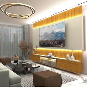 Estrutura: 100% MDF Acabamento: Pintura U.VPorta: Sim, 03 portas com sistema magnético para abertura suave das portas Ripado: Sim, Ripas autênticas LED: Sim, na cor branco frio Diferencial: Home com bancada suspensa; Portas com pulsadores toque magnéticoDimensões do produto montado