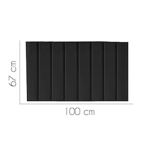 - Largura: 100 cm; - Altura: 67 cm; - Profundidade: 11 cm; - Produto estofado; - Produzido em Madeira de Pinus e Eucalipto; - Pés em pvc;