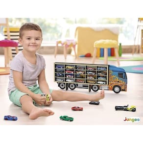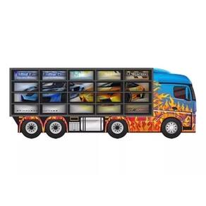 - EXPOSITOR CAMINHÃO PORTA HOTWHEELS 20 CARRINHO - Especial para carrinhos Hot Wheels (em escala 1:64)Produto fabricado no Brasil com Inmetro e de SUPER Qualidade. Os meninos vão brincar e guardar sua coleção de carrinho com estilo !!!*CARACTERISTICAS*- Capacidade para 20 carrinhos em escala 1:64 (HotWheels)- Formato de caminhão- Nichos de 9,2x3,5cm cada- Produto montado e decorado- Opção de pendurar na parede (acompanha bucha) ou Manter em pé sobre prateleiras e mesas (acompanha suportes)* Não acompanha carrinhos (imagens meramente ilustrativas)FABRICADO EM madeira de MDF com pintura atóxica e detalhes em serigrafia.Dimensões do produto: 64x05x25 cm