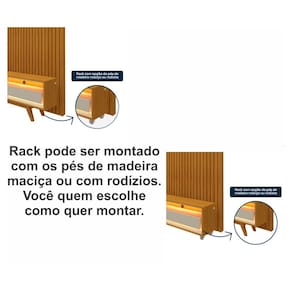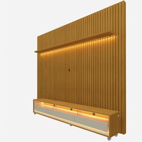 Painel:Estrutura: Material 100% MDFAcabamento: Pintura U.V, atóxicoPrateleira: Sim, prateleiras decorativas chanfrada com bordas laqueadas, com duas opções de encaixe, superior e inferiorLED: Sim, com luz quente de difusorPainel: Ripas autênticas de MDFSuporta: TV de ate 85”Rack:Estrutura: Material MDF/MDPAcabamento: Pintura U.V, atóxicoPrateleira: Sim, chanfrada com bordas laqueadasGaveta: Sim, 03 gavetas chanfradas com bordas laqueadas e corrediças telescópicasLED: Sim, luz quente com difusor na parte inferior e superior do nichoVidro: Sim, nas divisórias com 8 mm de espessuraSuporta: TV de ate 85”Pés: Duas opções de pés, com madeira maciça ou rodízios com rodas duplas siliconadasDiferencial: Painel com ripas autênticas de MDF, design elegante e modernoDimensões do produto montado