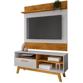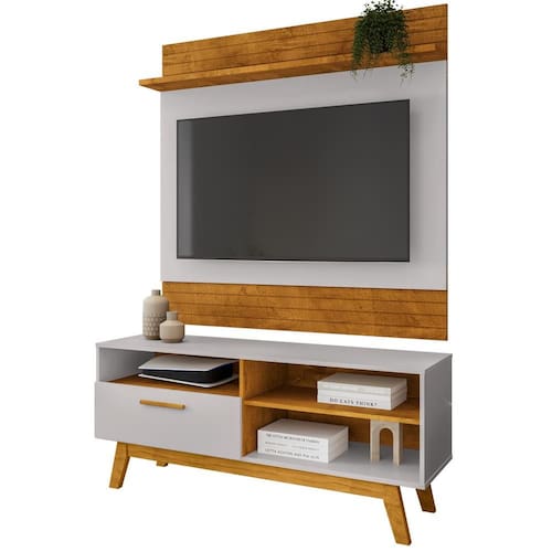 Painel Suspenso Guarujá e Rack Bancada Paládio, conjunto moderno que alia praticidade e estilo para sua sala. Estrutura em MDP/MDF com acabamento em pintura UV texturizada. Conta com frisos decorativos em baixo relevo, painéis sobrepostos (MDF 15mm), prateleira superior (MDP 25mm), porta basculante com dobradiças metálicas, puxador revestido em MDF, nichos funcionais, passa fios e pés em madeira maciça (Pinus). Suporta TVs de até 55 polegadas. Este produto será entregue em 2 volumes.