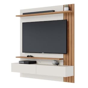 Minimalista e clean, o Home Suspenso Juriti é um painel funcional e uma ótima opção para clientes que buscam um móvel para otimizar o espaço para TV sem abrir mão de televisores maiores, seja ele na sala de estar, home cinemas ou até mesmo em quartos. Com ripados decorativos em sua lateral, possui uma prateleira superior e outra inferior, além de duas portas basculantes com espaço interno para acomodar objetos de maneira prática e organizada. Suporta TV até 65.