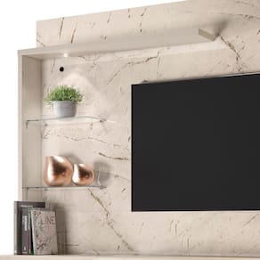 ESPECIFICAÇÕES: Estrutura em MDP Pintura UV 2 Portas frisadas deslizantes que se sobrepõem 2 Prateleiras de vidro 5mm Prateleiras em MDP Puxadores em poliestireno cromado Luminária de LED Ideal para TV até 50