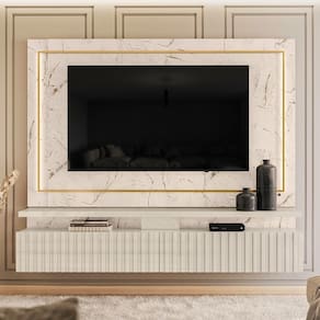 Painel Home Suspenso Gaia Calacata/off White Para Tv Até 75 - Madetec Calacata/off White Painel Home Suspenso Gaia para TV até 75 - Madetec O Painel Home Suspenso Gaia destaca-se por seu design inovador e elegância. Com um quadro de metal de design sofisticado e fitas de LED que iluminam a sua sala, este móvel é tanto bonito quanto funcional. Ele possui duas gavetas com detalhes ripados que ajudam a manter o ambiente organizado e é ideal para TV de até 75. ESPECIFICAÇÕES: - Estrutura em MDP - Pintura UV - 2 Gavetas com detalhes ripados - Corrediças telescópicas - Prateleiras - Quadro de metal - Fitas de LED - Painel desenvolvido para ser fixado na parede - O televisor deve ser fixado no painel - Ideal para TV até 75