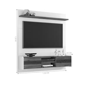 O painel suporta TVs de até 55 polegadas e possui prateleira superior de 25 mm, ideal para apoiar objetos decorativos e complementar a composição do ambiente. Conta ainda com 2 portas basculantes com dobradiças metálicas, que ajudam a manter aparelhos e acessórios mais organizados, além de trazerem um visual clean ao móvel.