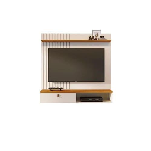 Desenvolvida para ser fixada diretamente na parede, a bancada Íris oferece uma solução funcional e estilosa para organização do ambiente. O televisor deve ser instalado no painel integrado, e o móvel suporta TVs de até 55", sendo ideal para espaços compactos e modernos.
