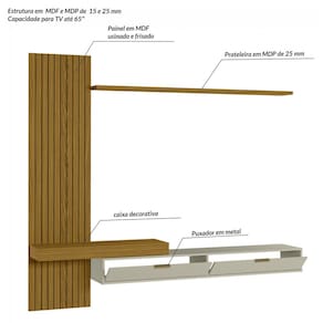 O Painel Italy Ripado Frizz é um produto com um design de frisos caracterizando o ripado, facilitando a limpeza e deixando-o mais clean. Sua estrutura é em MDF e MDP de 15 e 25 mm. Possui uma prateleira de 25mm, um painel em MDF frisado na vertical e um nicho moderno possuindo dois compartimentos com portas basculantes, puxadores em metal e uma caixa sobreposta como decoração. É um produto inovador com estilo italiano onde sua TV você poderá instalar na parede, deixando seu ambiente personalizado e exclusivo.