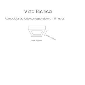 Dimensões AxLxP (cm): 2,5 x 29,4 x 29,4 Frequência: 50/60 Hz Voltagem: Bivolt Cor: Branco Potência: 24W Temperatura da Cor: 6500K - Branco Frio Instalação: Sobrepor