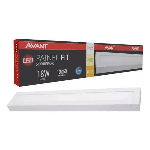 - Marca: Avant; - Modelo: 488101378; - Tensão: Bivolt; - Cor Predominante: Branco; - Formato: Retangular; - Material: Alumínio, Policarbonato; - Fluxo Luminoso: 1080 lm; - IRC (Índice de Reprodução de Cor): >70; - Ângulo: 120; - Potência: 18W; - Cor da Luz: Branco Frio; - Temperatura Cor: 6500K Frio; - Estilo: Clean, Técnico; - Garantia: 12 meses contra defeitos de fabricação.