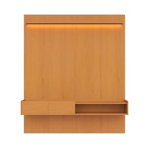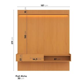 Possui largura de 187 cm e altura total de 219 cm, oferecendo um visual imponente e ideal para acomodar TVs de grandes polegadas. Seu design clean cria um fundo elegante para a TV, enquanto a iluminação superior adiciona aconchego e sofisticação ao ambiente, destacando o conjunto.
