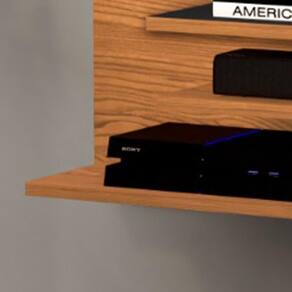Praticidade: Nichos e prateleira de vidro para organizar eletrônicos e peças decorativas.