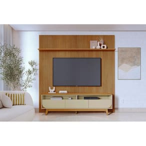 MDP, MDFA Composição Luna combina design sofisticado e funcionalidade, sendo fabricada com uma estrutura em MDP e MDF, com chapas de 12, 15 e 25mm, que garantem resistência e durabilidade, e revestida com pintura UV de alta qualidade, que proporciona um acabamento impecável. Suas dimensões são de 2,380 x 2,445 x 0,185m para o painel e 2,000 x 0,625 x 0,360m para a bancada, oferecendo amplo espaço para acomodar TVs de até 75 polegadas. O painel apresenta um elegante frisado em MDF com design em baixo relevo, enquanto a bancada possui um tampo suspenso de 25mm com borda chanfrada, conferindo modernidade ao ambiente. Conta com três gavetas com corrediças telescópicas, sendo duas laterais com detalhes curvos que adicionam sofisticação e uma prateleira para organização adicional, além de pés usinados que garantem estabilidade e estilo. O espaço para TV é de 2,380 x 1,200mm no painel e 2,000 x 0,360m na bancada, suportando um peso total de até 45kg. O sistema de montagem Girofix facilita a instalação, tornando a Composição Luna a escolha ideal para transformar sua sala em um ambiente moderno e acolhedor.