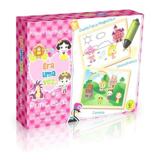 Brinquedo educativo que de um lado contém uma lousa branca magnética, e do outro lado um cenário magnético, onde a criança irá usar a imaginação e a criatividade, utilizando os personagens para criar lindas histórias de faz de conta.