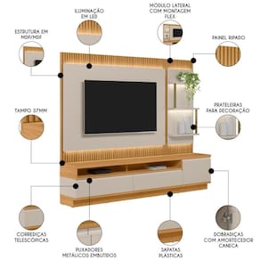 O painel ripado comporta uma de até 70 polegadas, enquanto a bancada e as prateleiras laterais permitem a exposição de itens decorativos. As hastes metálicas presentes nas prateleiras laterais trazem um toque industrial, criando um ar contemporâneo. Além disso, a luminária de LED nas prateleiras proporciona um visual ainda mais interessante e aconchegante. Para mais funcionalidade, os dois nichos do rack são ideais para a instalação de aparelhos eletrônicos como DVD, home theater e vídeo game e tudo com organização, já que possui passa-fios, ou seja, nada de fios aparentes.