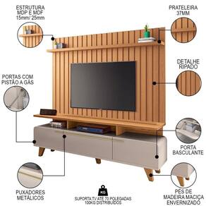 Com um design moderno e sofisticado que mescla o estilo orgânico com cantos arredondados. o Rack Bancada possui três portas basculantes com pistão a gás, que garantem mais praticidade e segurança na hora de guardar seus objetos. Os puxadores metálicos em tom dourado dão um toque de charme e requinte ao móvel, que conta ainda com pés de madeira maciça com acabamento envernizado. A bancada é produzida em MDP e MDF de 25mm e 15mm, materiais resistentes e duráveis. O Painel Para é um show à parte, com um ripado de fábrica que confere mais beleza e sofisticação ao ambiente. O painel possui uma prateleira com espessura de 37mm, ideal para apoiar seus objetos decorativos ou eletrônicos. Além disso, o painel tem uma montagem , que permite duas opções de utilização invertendo sua instalação na parede para deixar a prateleira superior ou inferior. O painel é feito em MDP e MDF de 37mm e 15mm, e é ideal para compor o ambiente com a bancada. Você vai se surpreender com a qualidade e o estilo desse conjunto!
