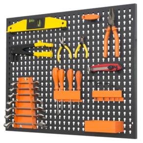 Painel Para Ferramentas - 40414 - Presto Painel para Ferramentas - 40414 - PRESTO Descrição: Kit Painel + Ganchos Plásticos (24 ganchos) para ferramentas totalmente confeccionado em chapa de aço de baixo teor de carbono com espessura de 0,60mm com sistema de dobra simples na parte superior e inferior e dobras duplas nas laterais. Possui 04 (quatro) furações para instalação nas dobras laterais em formato oblongo para encaixe do painel aos parafusos previamente instalados na parede. Acabamento superficial através de tratamento químico antiferruginoso e fosfatizante com pintura eletrostática a pó com camada mínima de 70 micras. Acompanha kit misto de ganchos plásticos (5 un. gancho reto curto, 5 un. gancho reto longo, 4 un. gancho olhal 08mm, 4 un. gancho olhal 14mm, 4 un. gancho curvo e 2 un. gancho duplo). OBS: Ferramentas e acessórios de aço não inclusas.