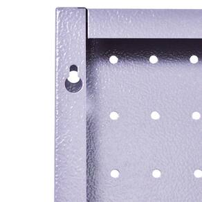 Painel para ferramentas totalmente confeccionado em chapa de aço de baixo teor de carbono com espessura de 0,60mm com sistema de dobra simples na parte superior e inferior e dobras duplas nas laterais. Possui 04 (quatro) furações para instalação nas dobras laterais em formato oblongo para encaixe do painel aos parafusos previamente instalados na parede. 360 (trezentos e sessenta) furações de diâmetro 5.3mm em dispostos 24 (vinte e quatro) linhas verticais de furos em passos de 28mm e 15 (quinze) linhas horizontais de furos em passos de 37mm. Acabamento superficial através de tratamento químico antiferruginoso e fosfatizante com pintura eletrostática a pó com camada mínima de 70 micras. Produto não acompanha ganchos nem parafusos para a fixação. Produto: Largura Altura Profundidade Peso Carga Máxima Diâmetro Espessura 725mm 575mm 20mm 2,29kg 30kg distribuidos - Chapa 0,60mm Embalagem: Largura Altura Profundidade Peso 745mm 595mm 40mm 2,33kg