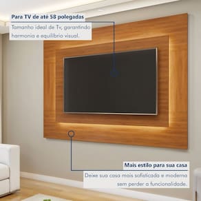 É um painel para salas grandes? Sim, pode ser utilizado na decoração para sala pequena e quanto para sala grande. Produto Montado: Sim Acabamento: Pintura UV Acompanha Lâmpada: Não Ambiente Principal: Sala de Estar codigo_ean: 7900288246158 Complexidade da Montagem: Média: pode ser montado por mais de uma pessoa e/ou necessite de maior conhecimento para montagem Cor: Naturalle Cor do Produto: Naturalle Cor Interna: Naturalle Escala de Brilho: Semi-Brilho Espessura do Espelho: mm Espessura do Painel: 7 cm Fixação na Parede: Sim Ideal para TVs até (Polegadas): 58 Itens Inclusos: 1 Painel e Kit Ferragens Linha ou Coleção: Grécia Manual de Especificação Técnica: https://product-hub-prd.madeiramadeira.com.br/333734940/documents/eb48c875-9052-40f9-9ef6-32dfdfe3ffe4dd1214110painelatenas18001.pdf Manual de Montagem e Instalação: https://product-hub-prd.madeiramadeira.com.br/333734940/documents/42175294-0692-4cb5-ac16-33586549cce46e1214111painelatenas18001.pdf Marca: Mavaular Material Principal: MDF Necessita Montagem: Sim Origem do Produto: Nacional Peso: 39,4 kg Possui Espelho: Não Possui iluminação: Sim Possui Passa Cabos: Não Possui Pés: Não Possui Portas: Não Possui Prateleiras: Não Possui Vidro: Não Recomendações de Uso, Manutenção e Limpeza: Limpar com flanela limpa e seca. Não usar produtos abrasivos. Sistema de Montagem: Parafusos Suporte de TV Universal Incluso: Não