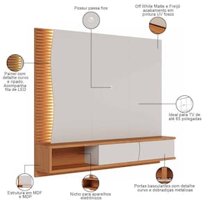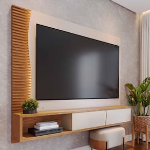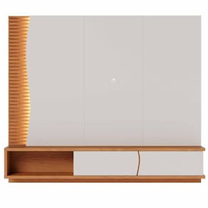 Seu design inovador apresenta um painel ondulado e ripado que traz dinamismo ao ambiente, enquanto as luzes de LED proporcionam um efeito visual acolhedor e sofisticado. Com uma estrutura robusta, o tampo e a base de 25mm garantem a resistência necessária para suportar seu entretenimento, enquanto as portas basculantes com detalhe curvado oferecem um toque de elegância e contribuem para manter o espaço organizado. Em outras palavras, esse painel suspenso foi desenhado para TVs de até 65 polegadas com instalação no painel, ou seja, é a solução perfeita para quem busca unir beleza e praticidade de forma harmônica.