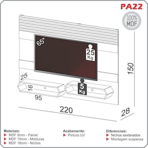 Painel suspenso de 220cm com dois nichos, produzido em mdf, na cor off white, acabamento em pintura UV 7 camadas, alta durabilidade, ripado na parte superior na cor freijo madeirado fosco, com passa fio para televisão.. moderno, de fácil instalação, combina perfeitamente com outros produtos de nossa fabricação. Produto Montado: Sim Acabamento: Pintura UV Ambiente Principal: Sala de Estar codigo_ean: 7900288226082 Complexidade da Montagem: Média: pode ser montado por mais de uma pessoa e/ou necessite de maior conhecimento para montagem Cor: Freijó / Off White Cor do Produto: Freijó / Off White Cor Interna: Off White Escala de Brilho: Brilhante Espessura do Painel: 28 cm Fixação na Parede: Sim Ideal para TVs até (Polegadas): 65 Itens Inclusos: 1 Painel, Kit Ferragens e Manual de Montagem Manual de Montagem e Instalação: https://product-hub-prd.madeiramadeira.com.br/269645122/documents/814d8b8b-4a1e-4183-a3b9-b095cd6e422c3192425378117575021989978.pdf Marca: Dalla Costa Material Principal: MDF Necessita Montagem: Sim Origem do Produto: Nacional Peso: 47,2 kg Possui Espelho: Não Possui iluminação: Não Possui Passa Cabos: Sim Possui Pés: Não Possui Portas: Não Possui Prateleiras: Não Possui Tomada: Não Possui Vidro: Não Recomendações de Uso, Manutenção e Limpeza: Pano seco Sistema de Montagem: PARAFUSO e mini fix Suporte de TV Universal Incluso: Não