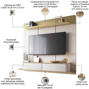 Esse painel suspenso vai redefinir o conceito de elegância em sua sala de estar; afinal, foi projetado para TVs de até 70 polegadas, sem contar que a combinação das linhas retas e cantos arredondados refletem as tendências atuais do design orgânico. Além disso, as duas portas basculantes se abrem apenas com um toque, o que oferece um visual minimalista e clean, ideal para quem busca um ambiente moderno e sofisticado.
