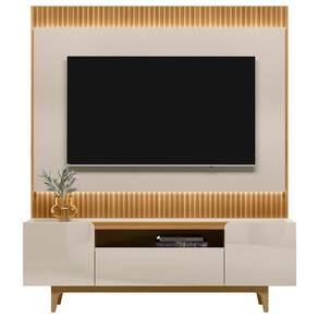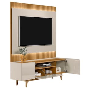 Com um design encantador, o rack para sala com pés de madeira maciça, além de toda a sua funcionalidade, sendo perfeito para a disposição de objetos decorativos e eletrônicos, bem como a organização de diversos itens no compartimento interno, graças as três portas; ainda traz um toque sofisticado para o ambiente, representado nos detalhes, como os cantos arredondados e o tampo rebaixado, que adicionam um toque exclusivo. Para adicionar mais espaço na superfície do móvel, o painel para tv é a opção ideal, já é capaz de suportar televisores de até 70 polegadas, a qual recebe o enfoque da luminária LED que deixa o ar mais acolhedor.