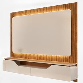 portas basculantes usinadas também são arredondadas, trazendo uma sofisticação a mais ao produto. Produto Montado: Sim Acabamento da Porta: Impressão Acabamento da Prateleira: Impressão Acompanha Lâmpada: 01 Ambiente Principal: Sala de Estar codigo_ean: 7900288239976 Complexidade da Montagem: Média: pode ser montado por mais de uma pessoa e/ou necessite de maior conhecimento para montagem Cor: Off White / Freijó Cor do Produto: Off White / Freijó Escala de Brilho: Super Brilho Escala de Brilho da Porta: Fosco e Alto brilho Escala de Brilho da Prateleira: Não Possui Espessura do Painel: 32,5 cm Espessura do Tampo: 25 mm Fixação na Parede: Sim Ideal para TVs até (Polegadas): 70 Itens Inclusos: 1 Painel e Kit Ferragens Linha ou Coleção: Treviso Manual de Especificação Técnica: https://product-hub-prd.madeiramadeira.com.br/925967875/documents/61659add-32be-4985-bf5f-b5121bd3aa923201788531617578580863481.pdf Manual de Montagem e Instalação: https://product-hub-prd.madeiramadeira.com.br/925967875/documents/075591d4-bad7-49c4-8c51-c2eadbed63053201787531617578580829635.pdf Marca: Dj Móveis Material da Porta: MDF Material da Prateleira: MDF Material Principal: MDF Necessita Montagem: Sim Peso: 89,9 kg Peso Máximo por Prateleira: 5 kg Possui Espelho: Não Possui iluminação: Sim Possui Nichos: 02 Possui Passa Cabos: Sim Possui Pés: Suspenso Possui Portas: Sim Possui Rodízio: Não Possui Vidro: Não Recomendações de Uso, Manutenção e Limpeza: Para manter seu móvel novo por muito mais tempo, evite locais úmidos, mantenha-o distante de líquidos e de fontes de calor. Evite a exposição prolongada ao sol. Para limpá-lo com segurança utilize uma flanela seca sem produtos abrasivos e nem lustra móveis. Sistema de Montagem: Minifix, cavilhas e parafusos Suporta Até (kg): 50 kg Suporte de TV Universal Incluso: Não Tipo de Puxador da Porta: Não possui