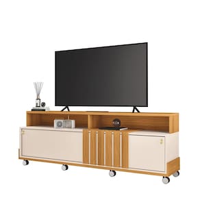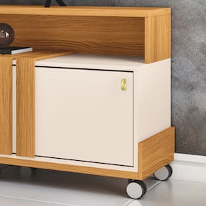 O Painel para TV 70" Bancada com Rodízio Karen Cinamomo/Off White é a opção ideal para quem deseja unir praticidade, elegância e qualidade na Sala de Estar. Ele é perfeito para TV de até 70 polegadas, que pode ser colocada sobre o seu tampo robusto e espesso de 25mm. Conta com duas portas de correr com trilho em alumínio, que deslizam suavemente, proporcionando um acesso prático ao espaço interno, ideal para armazenar objetos e aparelhos eletrônicos. Os puxadores em poliestireno, com design exclusivo e acabamento dourado, são um detalhe elegante que harmoniza perfeitamente com os rodízios cromados de 50mm, garantindo não apenas sofisticação, mas também praticidade ao facilitar a movimentação do movimento para a limpeza. O detalhe ripado na frente do móvel combina perfeitamente o estilo rústico e com a modernidade, trazendo personalidade à decoração. Produzido em MDP e MDF de 25mm e 15mm, utiliza materiais resistentes e sustentáveis, garantindo durabilidade e respeito ao meio ambiente. Deixe sua sala mais charmosa e prática com o Painel Bancada Karen!