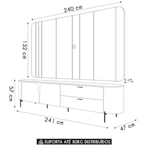 Este Rack Bancada conta com design contemporâneo, laterais e tampo curvados, e detalhes dourados que trazem um ar de luxo. Com duas portas com dobradiças metálicas e gavetas espaçosas, oferece praticidade e elegância para organizar seus itens. Além disso, a estrutura metálica dourada e os pés elevados garantem durabilidade e facilitam a limpeza. Já o Painel Suspenso é o complemento perfeito para este conjunto. Com cantos arredondados e divisões chanfradas, ele acomoda TV de até 75 polegadas com elegância e segurança. O painel possui luminárias douradas, que proporcionam um toque adicional de sofisticação ao produto. Fabricados em MDF de alta qualidade e ecológico, a bancada e o painel são a escolha ideal para quem busca beleza e praticidade.