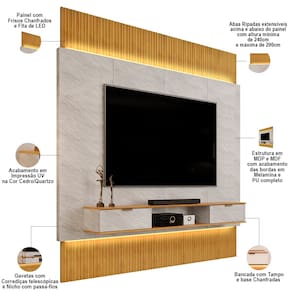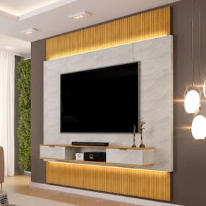 Não sabe qual móvel escolher para compor a sala de estar pequena? Com o Painel Para TV 85 Pol com Bancada Suspensa e LED Bit, da Lyam Decor, você encontra a solução compacta e elegante para a decoração e do seu ambiente. Cada detalhe foi projetado para oferecer a melhor experiência que você possa ter, a começar pela bancada suspensa dividida em três partes, sendo duas gavetas para guardar diversos objetos e um nicho para instalar aparelhos eletrônicos, garantindo máximo de funcionalidade enquanto aproveita seu entretenimento favorito. Já o painel para TV possui bordas chanfradas e fita de LED, os quais adicionam um toque decorativo e emolduram o amplo espaço para telas de até 85 polegadas. Além disso, as partes ripadas acima e abaixo do painel são extensíveis, adaptando-se perfeitamente à parede do piso ao teto, de acordo com a sua necessidade, proporcionando uma estética elegante e com acabamento sofisticado. Demais não é mesmo?! Então, comece hoje a transformar sua casa em um ambiente acolhedor com o Painel Bit.