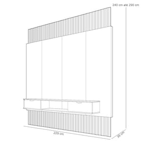 Abas ripadas extensíveis acima e abaixo do painel com altura mínima de 240cm e máxima de 290cm.