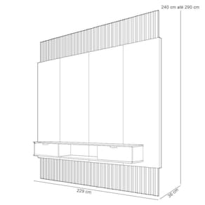 Abas ripadas extensíveis acima e abaixo do painel com altura mínima de 240cm e máxima de 290cm.