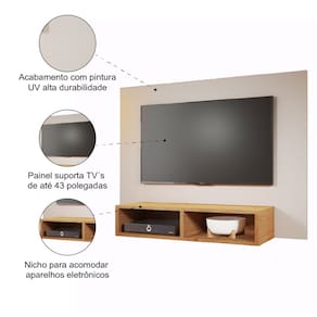 O Painel Suspenso Baden é a escolha ideal para quem busca funcionalidade e elegância. Projetado para TV's de até 43 polegadas, oferece segurança e ótimo aproveitamento do espaço. Conta com um nicho espaçoso para acomodar seus aparelhos eletrônicos e objetos decorativos com praticidade. O acabamento em pintura UV garante maior durabilidade e um visual moderno. Para completar, o sistema passa-fios mantém os cabos organizados e discretos, contribuindo para um ambiente limpo e harmonioso. Uma solução completa para deixar sua sala moderna, prática e cheia de estilo.