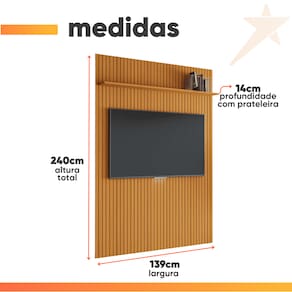 MEDIDAS: [ A ] = 240 cm [ L ] = 139 cm [ P ] = 14 cm MEDIDAS PRATELEIRA: [ L ] = 110 cm [ P ] = 14 cm PESO SUPORTADO: 40kg PESO: 57,90kg PRATELEIRA SUPORTA ATÉ: 2kg IDEAL PARA TV DE ATÉ: 55 polegadas MODELO: Painel para TV até 55 Polegadas Arbo 1,39x2,40m EDN MARCA: EDN COR: Cedro PINTURA: UV MATERIAL: MDP / MDF PRATELEIRAS: 1 DIFERENCIAL: Detalhe ripado GARANTIA: 3 meses pelo fabricante