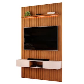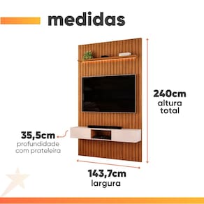 MEDIDAS PAINEL: A = 240 cm L = 143,7 cm P = 35,5 cm MEDIDAS PRATELEIRA: A = 2,5 cm L = 128 cm P = 15 cm MEDIDAS NICHO: A = 21,2 cm L = 143 cm P = 31,3 cm PESO SUPORTADO PAINEL: 40 kg PESO SUPORTADO NICHO: 30 kg PRATELEIRA PAINEL SUPORTA ATÉ: 5 kg PESO PAINEL: 46,7 kg PESO NICHO: 14,25 kg IDEAL PARA TV DE ATÉ: 55 Polegadas MODELO: Painel Para TV Até 55 Polegadas 1,43m Ripado Autêntico Com Led e Nicho Montreal MARCA: DJ Móveis COR: Madeirado/Off White PINTURA: UV de alta qualidade, 8 camadas ACABAMENTO: Melamina e PVC MATERIAL: MDP/MDF ESPESSURA DO MATERIAL DA ESTRUTURA: 12 mm e 15 mm PRATELEIRAS PAINEL: 1 PORTAS NICHO: 2 TIPO DE PORTA: Basculante PUXADOR: Cava ESPAÇO PARA PASSAR FIOS: Sim DIFERENCIAIS: Design moderno e sofisticado / Pintura UV de alta qualidade, 8 camadas / Espaço para aparelhos eletrônicos / Nicho com 2 portas basculantes para melhor armazenamento / Painel com ripado autêntico / Prateleira superior extensa com Led / Suportam TV de até 55 polegadas. INSTRUÇÕES E CUIDADOS: Para maior durabilidade, recomendável que a limpeza dos móveis seja feita com pano limpo e seco. Não usar produtos químicos ou abrasivos. GARANTIA: 3 meses pelo fabricante.