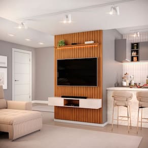 Com um design moderno e sofisticado, o conjunto Montreal une elegância e funcionalidade para transformar o ambiente. Produzidos com pintura UV de 8 camadas, oferecem acabamento superior, maior durabilidade e resistência ao desgaste do tempo. O painel com frisado autêntico traz charme e personalidade, enquanto a prateleira superior extensa com iluminação em LED valoriza a decoração e cria um toque de aconchego e modernidade. Já o nicho espaçoso com duas portas basculantes garante praticidade e excelente espaço para armazenamento de aparelhos eletrônicos e objetos diversos do dia a dia. Com estrutura elegante e design moderno, o conjunto suportam TV's de até 55 polegadas, tornando-se a escolha ideal e destaque para a sua sala de estar.