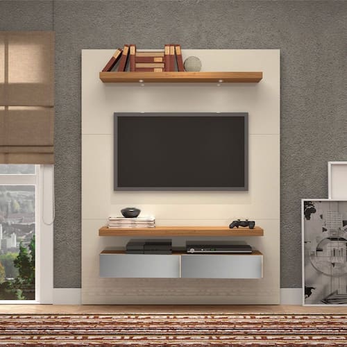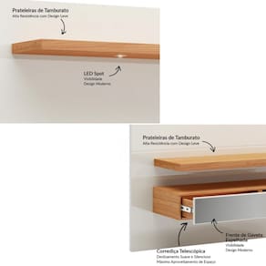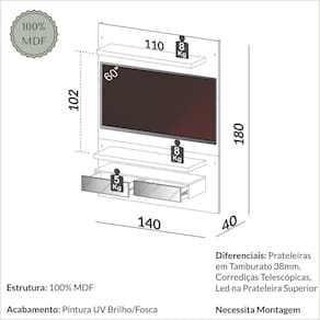 Características: Estrutura 100% MDF Acabamento em Pintura UV Necessita de Fixação na Parede 02 Gavetas Espelhadas com Corrediças Telescópicas 02 Prateleiras Leve e Resistente 02 LED's na Prateleira Superior Ideal para TV até 60 Polegadas
