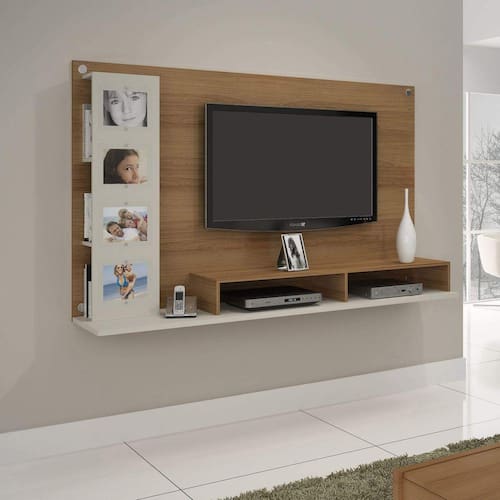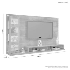 Painel sabiá é um produto muito funcional. Possui nicho para eletrônicos, revisteiro, porta retratos em vidro aplicado, tampo 25mm e acabamentos cromados. Réguas de fixação MDF 15 mm, bancada MDP 25 mm e restante MDP 15 mm. Acabamento: Pintura UV Altura: 108 cm calculo: unidade Complexidade da Montagem: Média: pode ser montado por mais de uma pessoa e/ou necessite de maior conhecimento para montagem Cr: Noronha/Off White Cr do Produto: Noronha/Off White Cr Interna: Noronha Escala de Brilho: Fosco Espessura do Vidro: 6 mm Estilo: Moderno Ideal para TVs até (Polegadas): 60 Informações Complementares: Acompanha Suporte para TV Itens Inclusos: Painel, Suporte para TV e Manual de Montagem. Largura: 182 cm Manual de Montagem e Instalação: cdn2.madeiramadeira.com.br/tecnico/jcm-moveis/31872-painel-sabia-jcm-passo-a-passo-f4.pdf Material Principal: MDP Montagem Flex: Não Necessita Montagem: Sim Origem do Produto: Nacional Peso: 42 kg Possui Espelho: Não Possui Gavetas: Não Possui iluminação: Não Possui Pés: Não Possui Portas: Não Possui Prateleiras: 01 Possui Tomada: Não Possui Vidro: Sim Profundidade: 32 cm Quantidade de Nichos: 05 Recomendações de Uso, Manutenção e Limpeza: Limpeza com pano umedecido. Não aplicar lustra móveis. Sistema de Montagem: Parafusos e Minifix. status-cadastro: Aprovado Suporta Até (kg): 35 kg Suporte de TV Universal Incluso: Sim Tamanho: