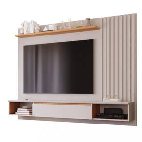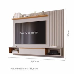 O Painel Bahamas possui espaço para TV de até 65 polegadas e uma prateleira superior com 2,5cm de espessura para objetos decorativos. O destaque principal fica por conta do aplique ripado na cor do produto. O tampo é espesso com 2,5cm e tem borda chanfrada com acabamento em laca. Possui também nicho inferior para equipamentos e uma basculante para auxiliar na organização da sua sala. A composição de cores traz o requinte do acabamento madeirado nos detalhes deixando prevalecer no produto as cores sólidas e neutras, assim ele pode combinar mais facilmente com qualquer estilo decorativo.