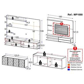 Dimensões do produto montado: Painel - Altura: 141,5cm | Largura: 180cm | Profundidade: 30cm Tamanho Painel TV - Altura: 141,5cm | Largura: 180cm Aparador - Altura: 39,5cm | Largura: 123,5cm | Profundidade: 31,5cm *Devido às variações de tamanho dos televisores no mercado, sugerimos que verifique as medidas da sua TV e compare com o painel antes de efetuar a compra. *Você pode consultar as medidas detalhadas na imagem técnica do produto.