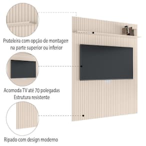 O Painel Arbo 1,80x2,40m é perfeito para quem quer dar um toque mais elegante ao ambiente! Com estrutura resistente e detalhe ripado em design moderno, conta com uma prateleira, ideal para acomodar objetos de decorações e, além disso, pode ser combinado com outros móveis e acomoda TV de até 70 polegadas!